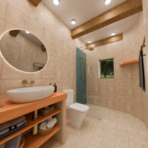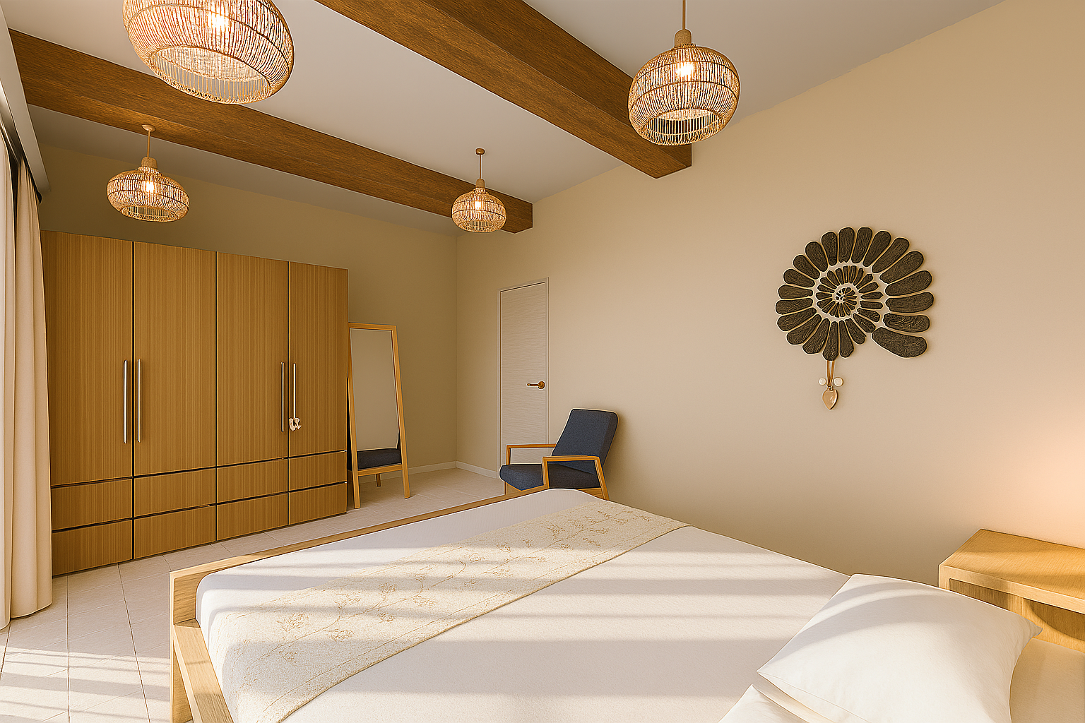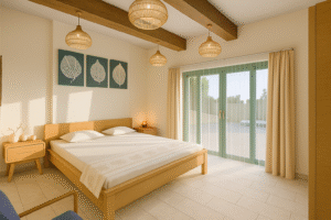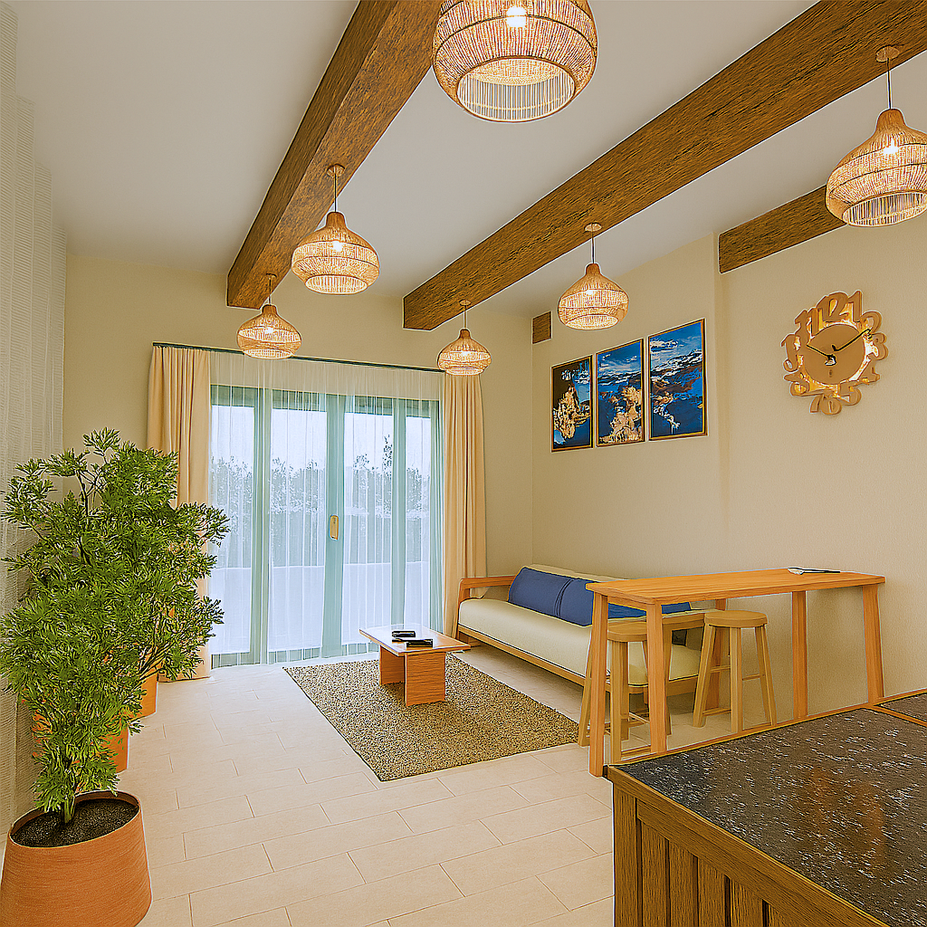 The residences will include aluminium or synthetic window and door frames with double glazing, insect screens, and traditional shutters, high-quality interior doors that harmonize with the overall design of the home, pre-installed internet access points in all rooms, flooring made of granite, porcelain or ceramic tiles, decorative ceramic wall tiles in the bathroom and above the kitchen countertop, soft-close kitchen cabinets made by a local carpenter, quality sanitary ware and HANSGROHE faucets in both the bathroom and kitchen, a bathroom vanity with a premium surface and vessel sink, a built-in wardrobe in the bedroom, entrance storage unit and a kitchen island with lower cabinetry, air conditioning units in both the living room and the bedroom, and a solar and electric water heater.