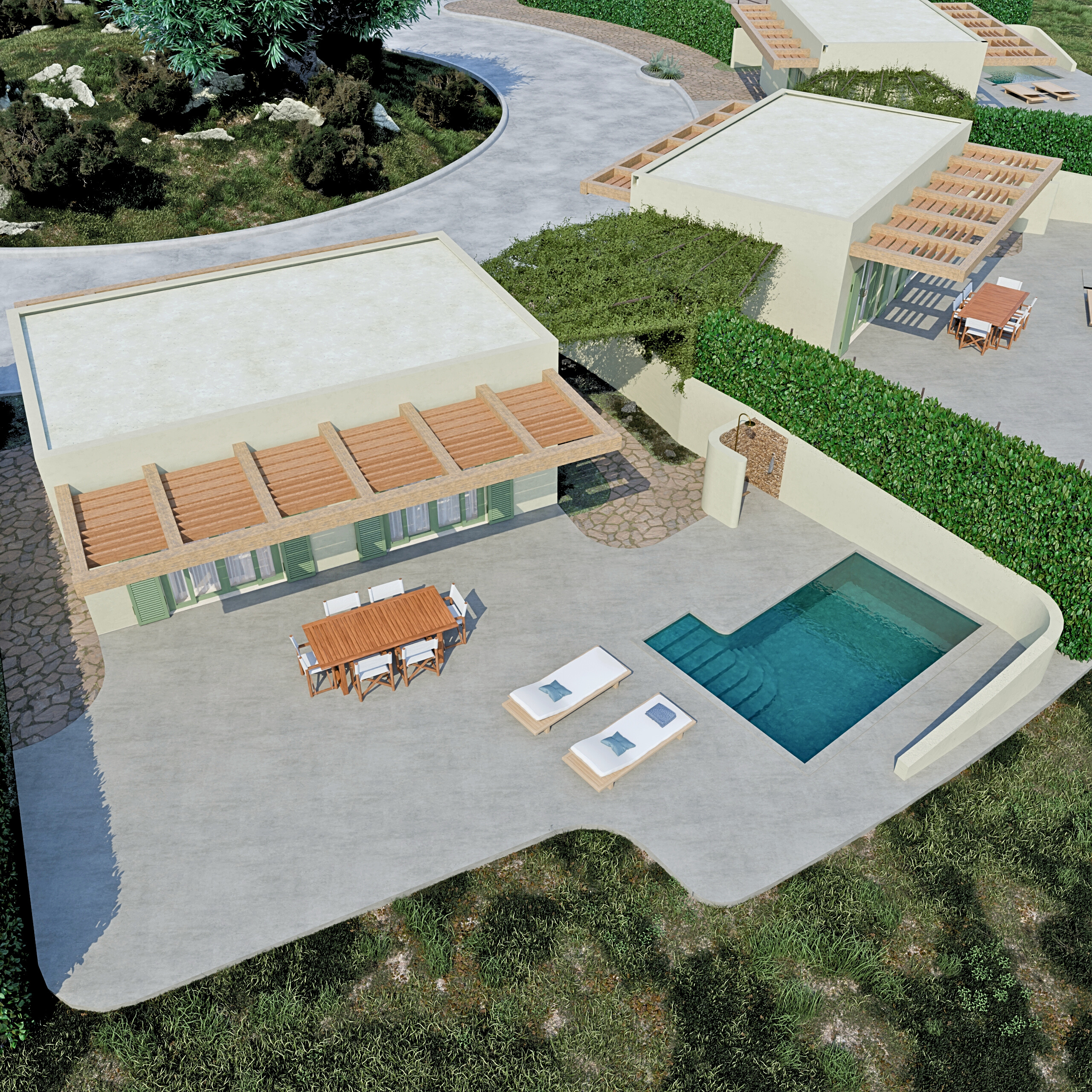 In the peaceful and picturesque village of Litsarda, in the wider region of Apokoronas in Chania, Crete, three independent residences are offered for sale, each situated on a private plot with an exclusive swimming pool and modern amenities. This is a particularly attractive project that combines contemporary architecture, high construction standards, and a privileged location with panoramic views of the Cretan landscape. The homes are single-level, with a total interior space of 47 sq.m., and include a spacious bedroom (11.88 sq.m.), a luxurious bathroom with a walk-in shower (5.90 sq.m.), and an open-plan kitchen, dining, and living area (18.62 sq.m.) with double doors leading out to the balcony. Each house features a private 12 sq.m. swimming pool, while pergolas at the front and back of the house offer shade and comfort without obstructing the view.
