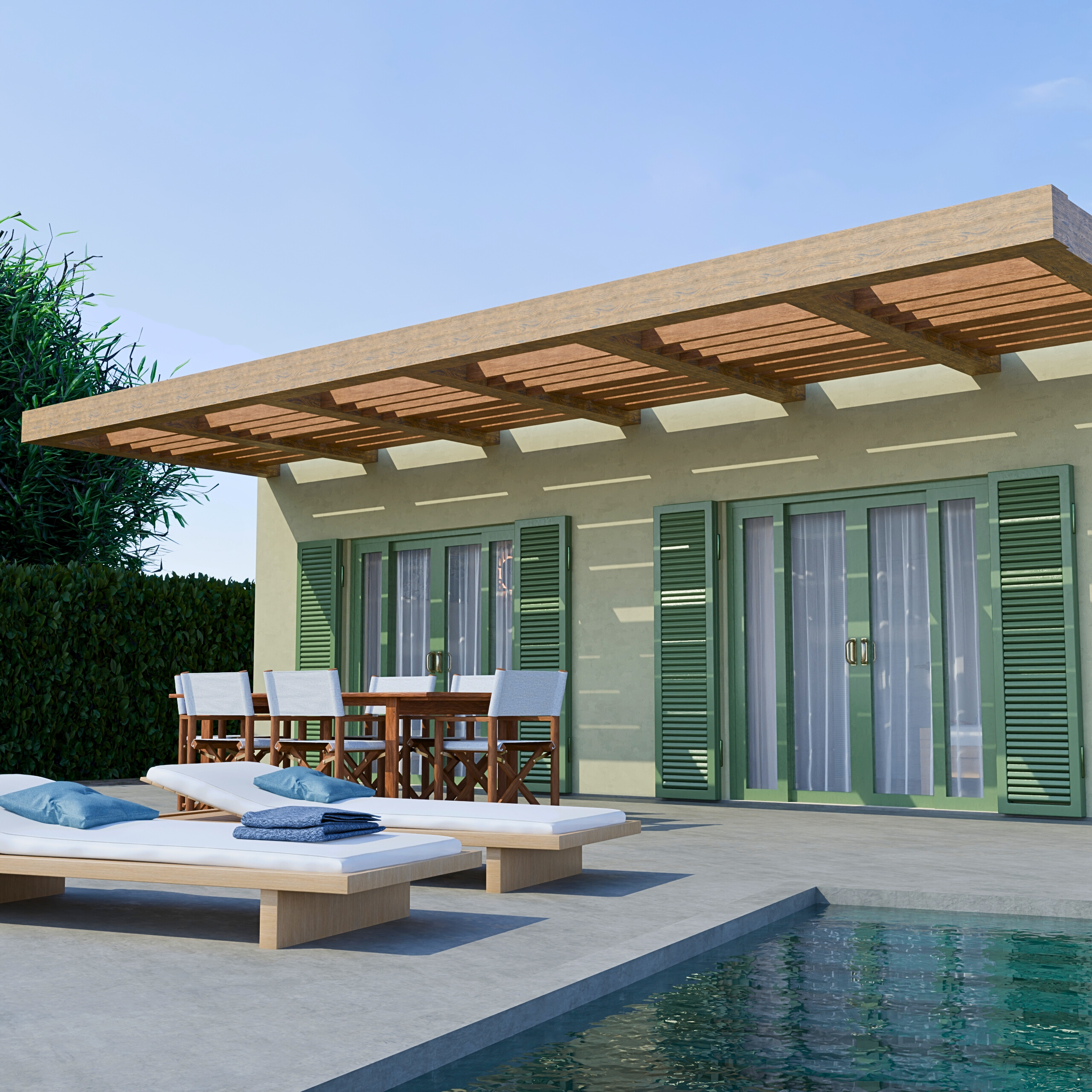 Exterior features include column-free pergolas at the front and back for comfort and unobstructed views, a private 12 sq.m. swimming pool with a custom cover, exterior facades finished in natural tones with modern design elements, a stylish front door with carefully designed outdoor lighting, terraces paved with ceramic tiles and natural stone paths, a beautifully landscaped garden with plants adapted to the local climate, and an outdoor shower next to the pool. The technical specifications are for illustrative purposes only and may be modified depending on material availability and the final decisions of the architect and consultants.