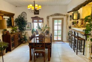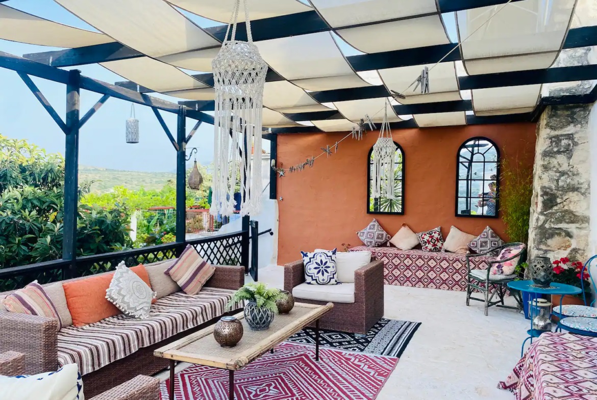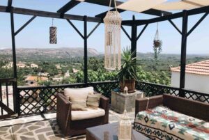 This stunning property is nestled in the charming village of Provarma, located in the Apokoronas region of Chania, Crete. It offers breathtaking views of the White Mountains, the countryside, and Souda Bay. The home seamlessly blends traditional Cretan elements, like wooden beamed ceilings and stone floors, with elegant Moroccan-style décor.
