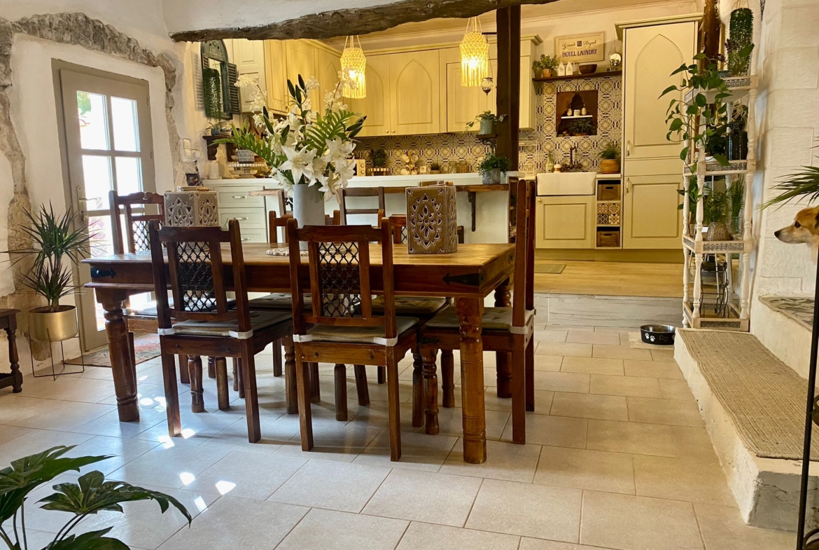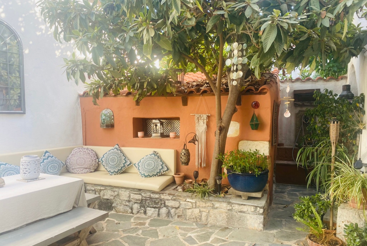 From the living room, stairs lead to the main bedroom, which boasts wooden ceilings and access to a semi-covered private terrace. Two steps down from the living room bring you to a fully equipped open-plan kitchen with a dining space. A back door opens to a private courtyard with built-in seating and a BBQ, perfect for outdoor meals. There’s also an external storage area.