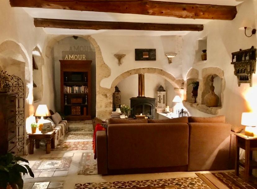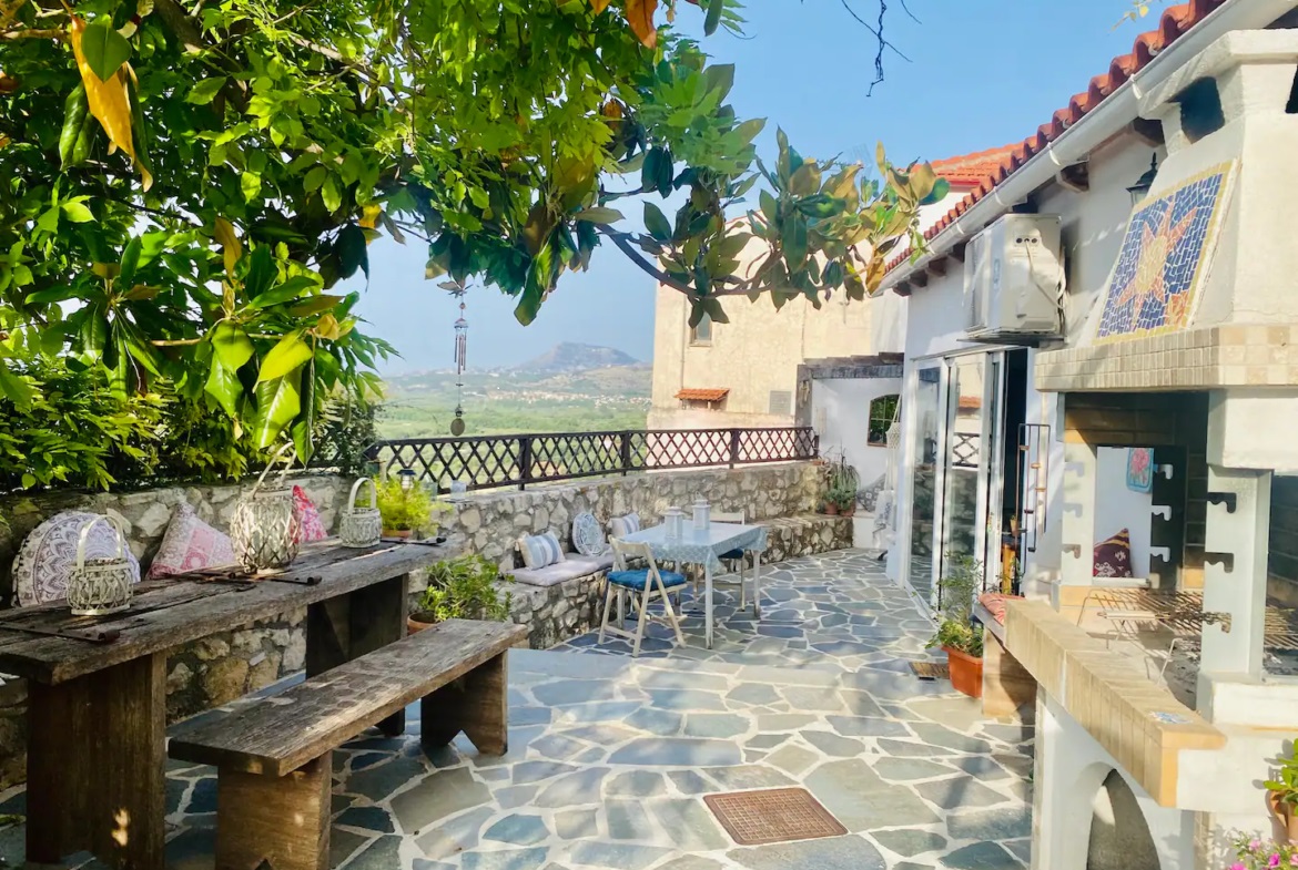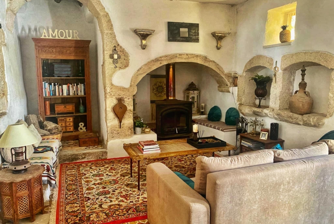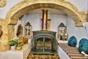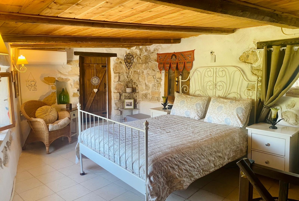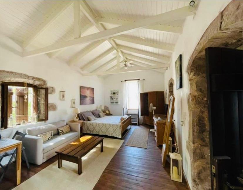 Second Guest Studio: Stone stairs from the courtyard lead to the second independent studio. This studio has its own entrance, courtyard, terraces, and BBQ. Inside, it offers a cosy living space with a wood-burning stove and a fully equipped kitchen.