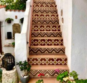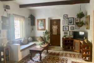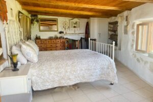 First Guest Studio: The upper-level studio, accessible from the central courtyard and the main bedroom’s terrace, features two spacious covered terraces ideal for outdoor lounging or dining. Inside, it includes a large open-plan kitchen with appliances, a combined living and sleeping area with high arched white ceilings, and a fireplace.